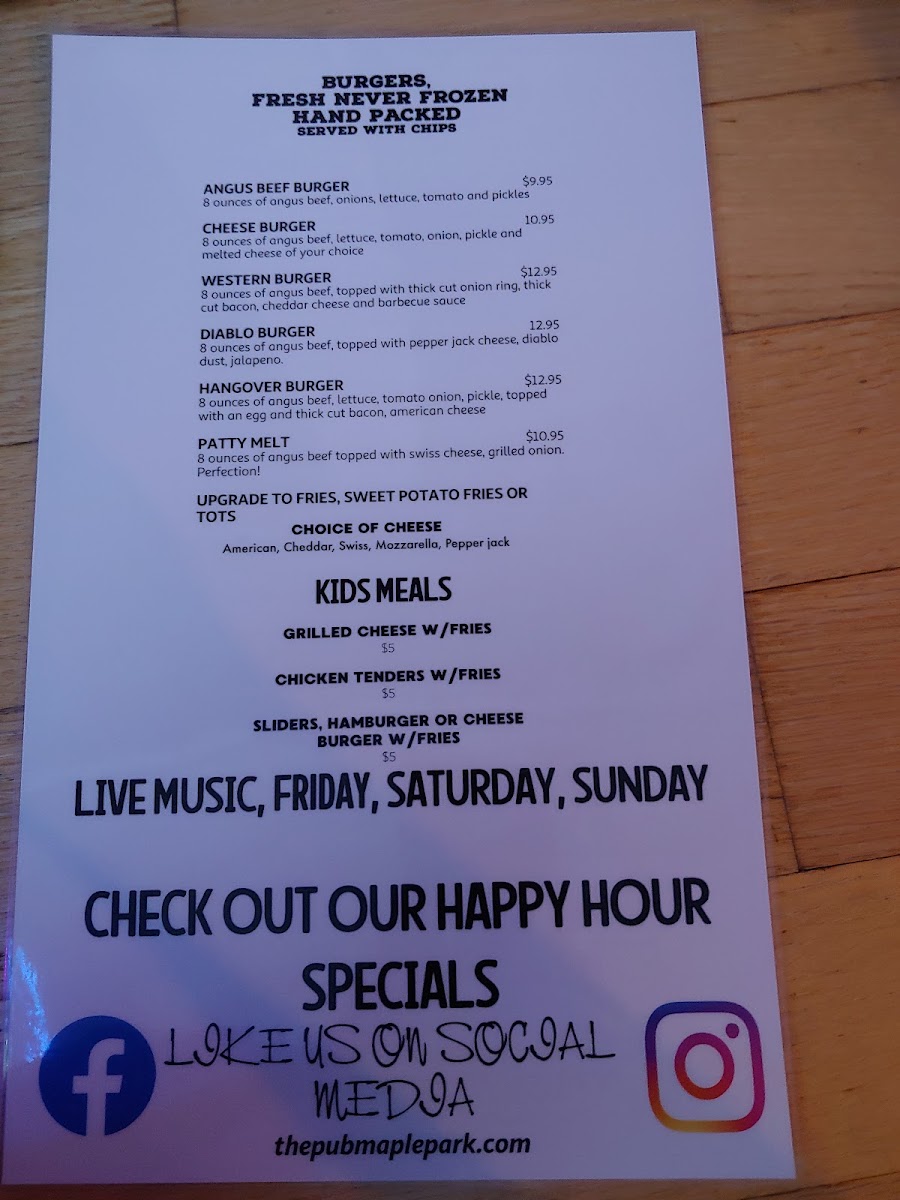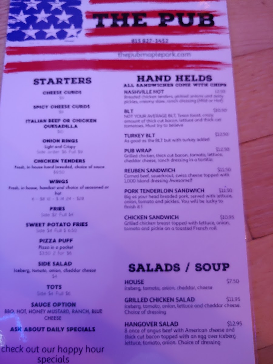 The Pub Maple Park, located at 221 Main St in the heart of Maple Park, IL, is a vibrant destination blending sports bar charm with a lively atmosphere. Known for its delightful hand-helds and sandwiches like the Pork Tenderloin and Turkey BLT, patrons rave about the food quality and quick service, enhanced by friendly staff. The inviting patio offers the perfect setting for enjoying live music, making it a favorite spot for casual dining and fun nights out. With its bustling ambiance, The Pub Maple Park is an essential stop for both locals and visitors seeking great food and entertainment.